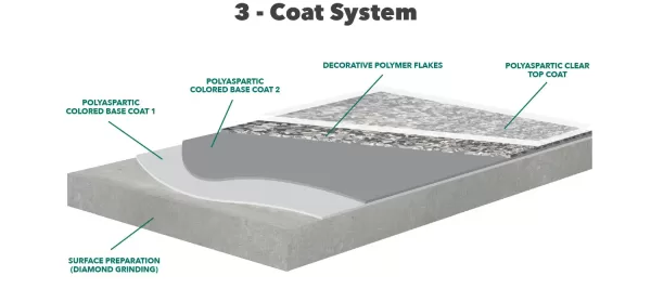 The LABFAST® 85 PRO is a high-solids, two-component (1A:1B), non-yellowing with reduced odor polyaspartic for concrete floor coating, commonly used with vinyl flakes. The colored LABFAST® 85 PRO serves as the base coat, while the clear version is used as a protective topcoat, LABFAST® 85 PRO provides optimal work time/cure time ratio. The utilization of the LABFAST® 85 PRO allows the installation of a full floor system in one single day, with rapid return to service. The LABFAST® 85 PRO displays excellent curing capability even at very low temperature levels. This product offers superior mechanical and chemical properties and is low maintenance. It also displays a superior aesthetic finish and excellent UV stability which makes it ideal for exterior applications. We recommend the utilization of the LABTEC vinyl chips in combination with the LABFAST® products. Two- or three-coat systems can be considered.